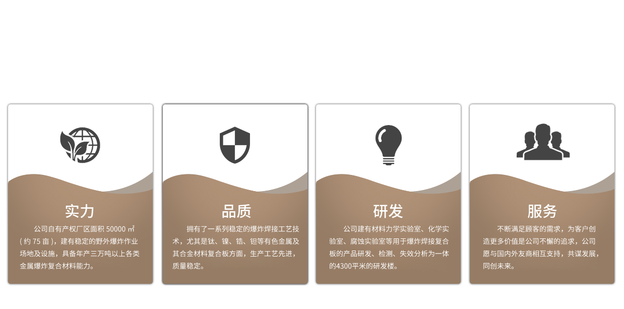 安徽弘雷金屬?gòu)?fù)合材料科技有限公司成立于2013年5月,坐落于宣紙之鄉(xiāng)—安徽省宣城市,專(zhuān)業(yè)從事各類(lèi)金屬爆炸復(fù)合材料研發(fā)、生產(chǎn)、銷(xiāo)售和咨詢(xún)。注冊(cè)資本伍仟萬(wàn)元,自有產(chǎn)權(quán)廠區(qū)6萬(wàn)余平方米(約90畝),建有自有產(chǎn)權(quán)的野外爆炸作業(yè)場(chǎng)地及設(shè)施,具備年產(chǎn)四萬(wàn)噸以上能力。...